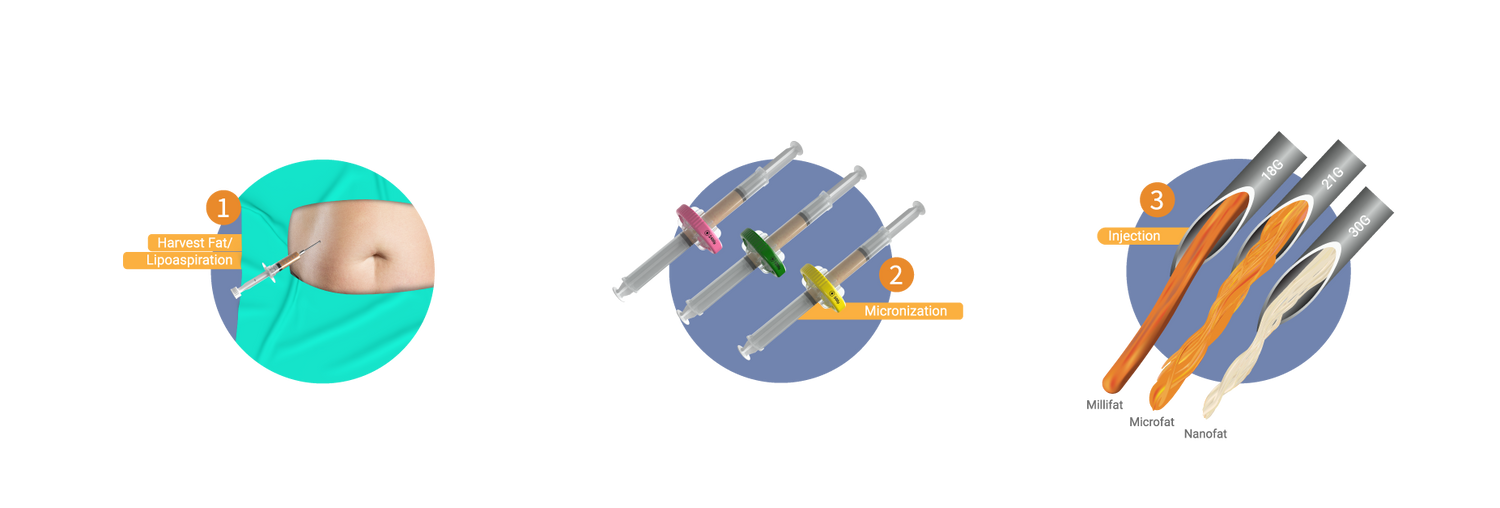 After processing through the correct number of microlyzers, the adipose is injected for the procedure. Milifat is a thick fat used for filling applications, microfat is used for deep wrinkles and general aesthetic appearance, and nanofat is used for superficial dermal and hair regeneration.