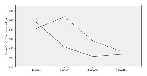 Changes in canthal smoothness scores over time: dotted line, PRP group; straight line, PRF group. (Using T-Lab PRP & PRF).
